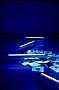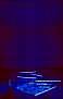 Trøndelag Kunstnersenter, Trondheim. Bøker, UV-lys og stjerner. UV-lys fjerner alt rom unntatt det som fluoriserer. Bøkenes innhold omhandler tema som har relevans både med hverdagen og filosofien. I taket var det fluoriserende lapper med bokstaver på. |
